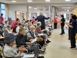 合唱団では、職員が合唱メンバーと指揮者に粉し登場。声出し練習の後から、歌詞カード片手に利用者の皆様と「ふるさと」「里の秋」等を合唱しました。