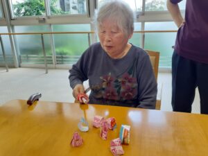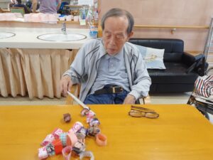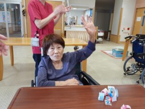 初めてのレクリエーションという事で、最初は「これは何ね?」「どがんすっとね?」と恐る恐る触られていました。ルールを説明し、実践してみると熱心に取り組まれ、制限時間を余裕で残し終了する猛者もいらっしゃいました。
