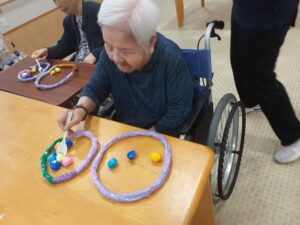 初めてのレクリエーションという事で、最初は「これは何ね?」「どがんすっとね?」と恐る恐る触られていました。ルールを説明し、実践してみると熱心に取り組まれ、制限時間を余裕で残し終了する猛者もいらっしゃいました。